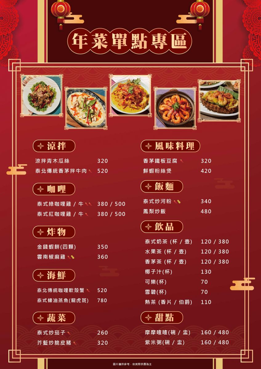 1. 春節期間僅供夜泰美春節限定菜單點餐(4人/6人/8人套餐及部分單點)。