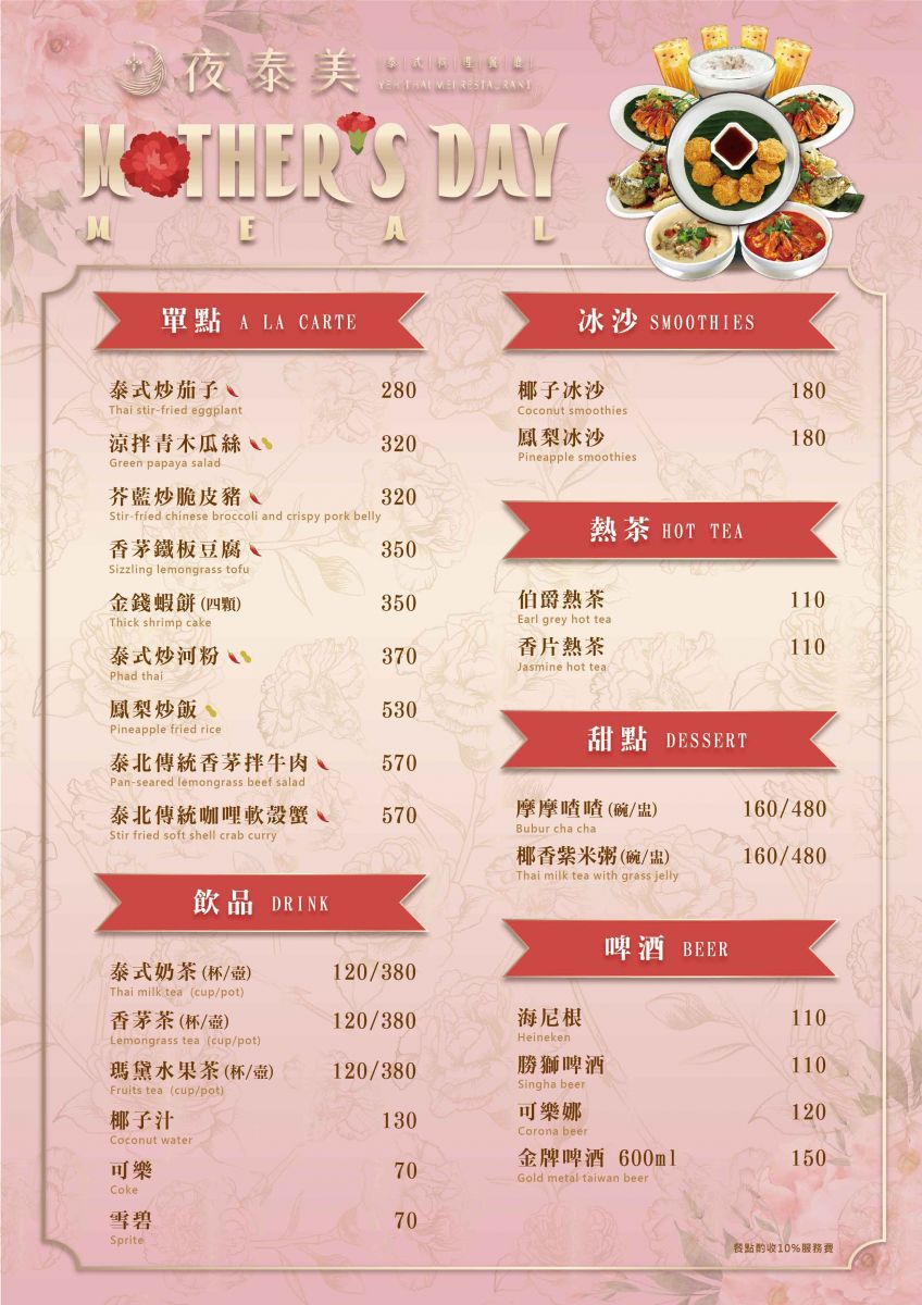 2. 母親節線上訂位完成後,請於3天內完成【訂金全額付款】,以上價格均須加收10%服務費。