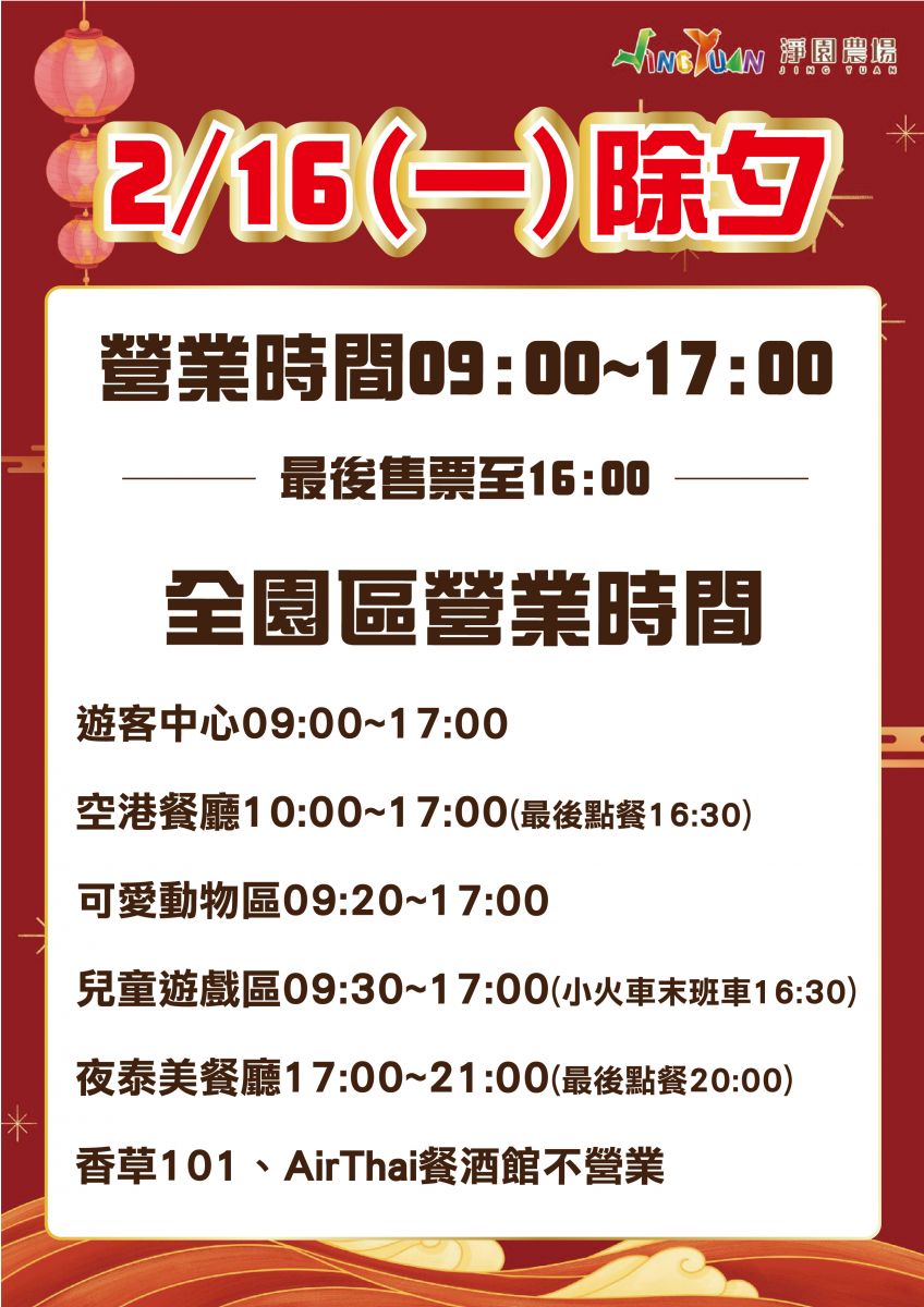 除夕 2/16(一) 營業時間09:00~17:00(最後售票至16:00)
